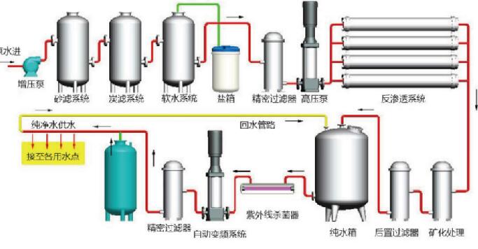 反渗透过程是利用半透性卷式膜分离去除水中的可溶性固体有机物、胶体物质以及细菌病毒。原水以一定压力通过反渗透膜,水透过膜的微小孔径,经收集后得到纯水。水中的杂质在留波中浓缩并被排出。RO膜可以去除原水中98%以上的溶解性固体,9%以上的有机物及胶体物质,以及几乎100%的细菌。我公司生产的系列反渗透纯净水设备,是采用美国最新的技术工艺,进口优质反渗透膜组件,根据用户水质情况精密设计制造具有设备运行稳定、出水水质好等特点。